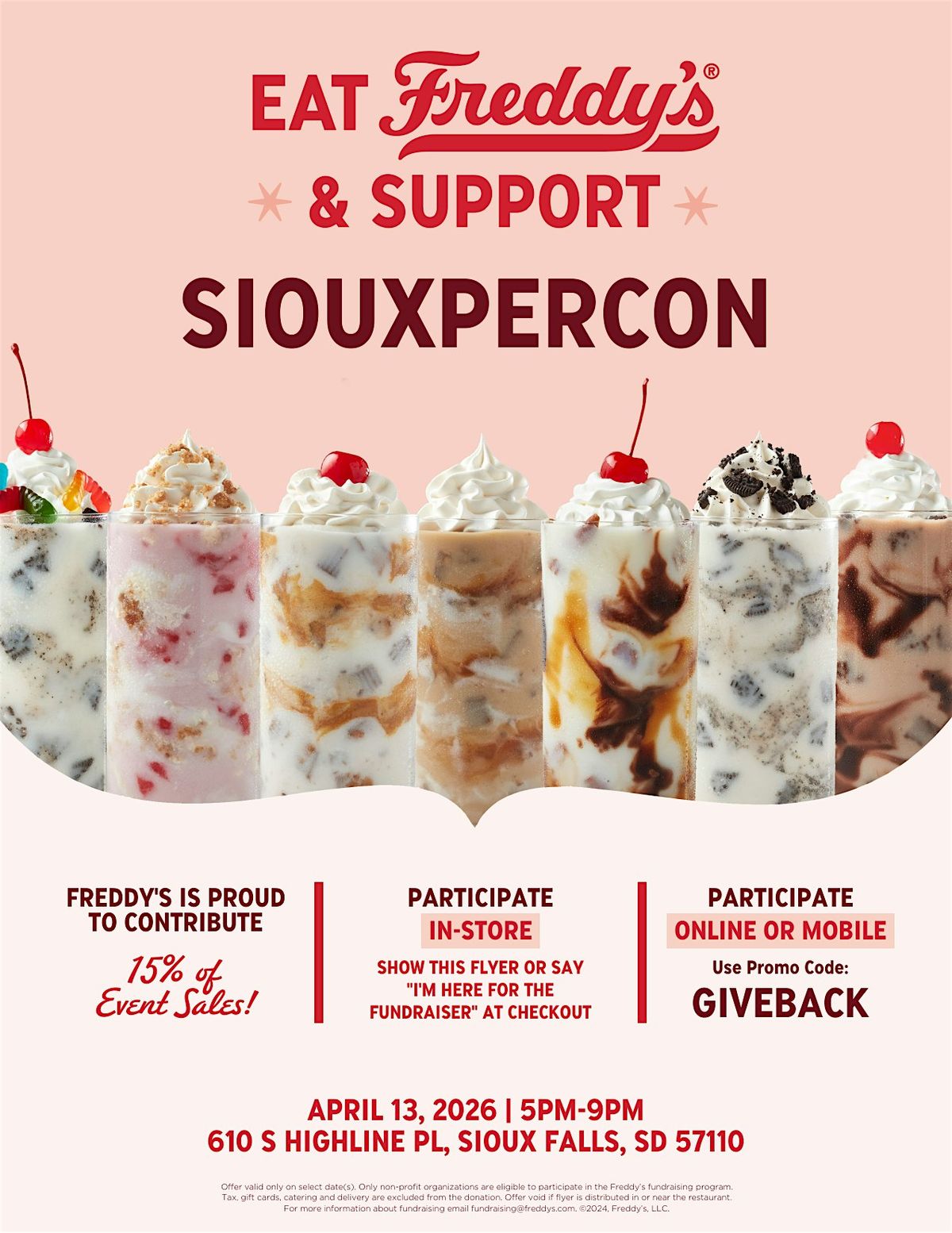 SiouxperCon will receive 15% of fundraiser sales* during this fundraiser. Participate on Apr 13 from 5:00pm to 9:00pm by ordering digitally or at the physical Freddy's restaurant. To participate digitally, order on the Freddy's mobile app or website using the code GIVEBACK. To participate at the restaurant, tell the cashier of your participation (before payment) or show the fundraiser flyer to the cashier (before payment).