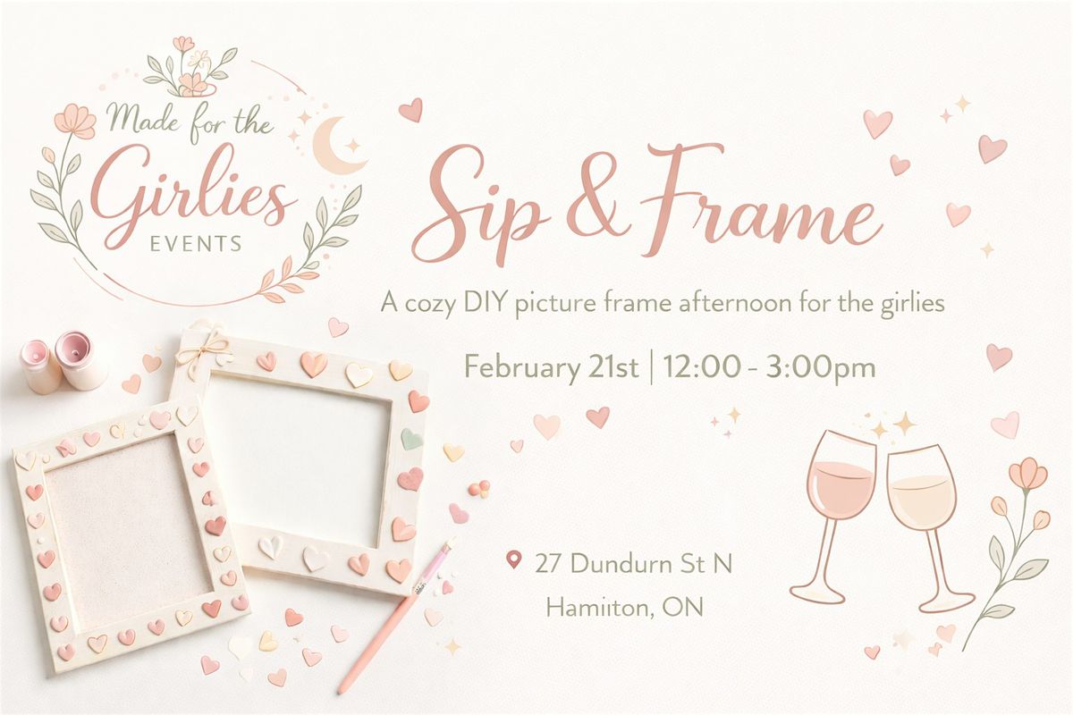 Welcome to Sip and Frame! Join us at 27 Dundurn St N on February 21, 2026, at 12:00 PM for a fun and creative event. Bring your friends and unleash your inner artist as we sip on delicious beverages and create beautiful frames together. Let's make memories and masterpieces! See you there!