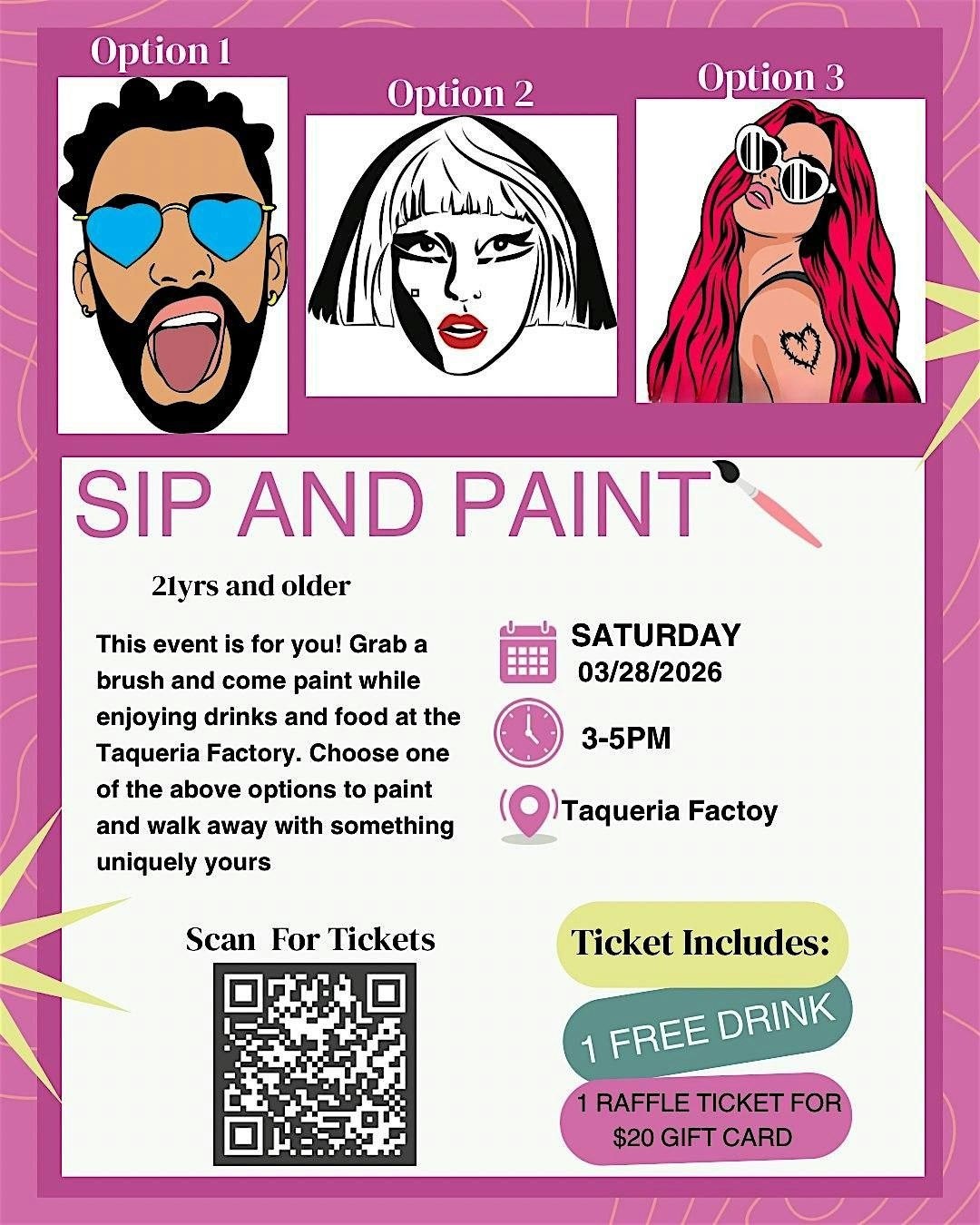 Ticket include 1 free drink and 1 raffle ticekt. This is a self guided paint class. All supplies included.