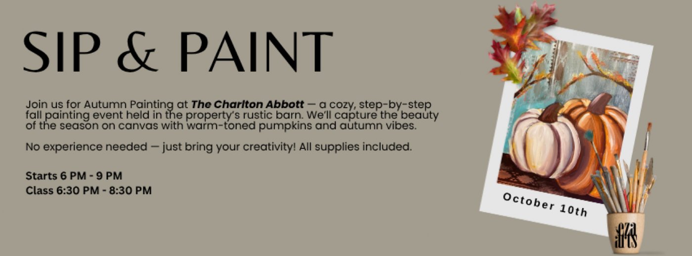 Join us for Autumn Painting at The Charlton Abbott in Willoughby, set inside the charming barn on the property this event will guide you through painting a beautiful autumn scene — featuring warm-toned pumpkins soft fall foliage and rustic patterns that capture the spirit of the season.