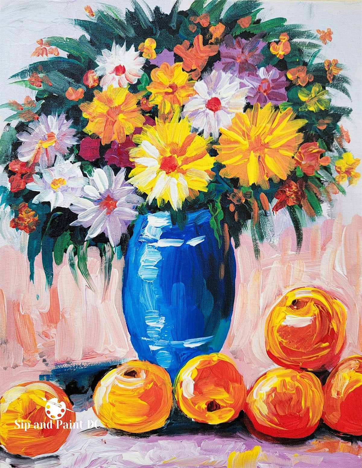 Sip and Paint Washington DC - Sunflowers and Oranges in Blue Vase