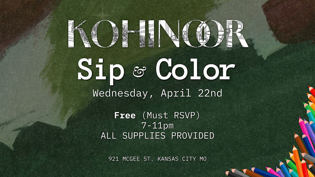 Unwind at Sip & Color at Kohinoor 🎨 Enjoy a relaxed evening of coloring, cocktails, and conversation. All supplies are provided—just bring yourself and settle in for a low-pressure, creative night. Free to attend with RSVP.