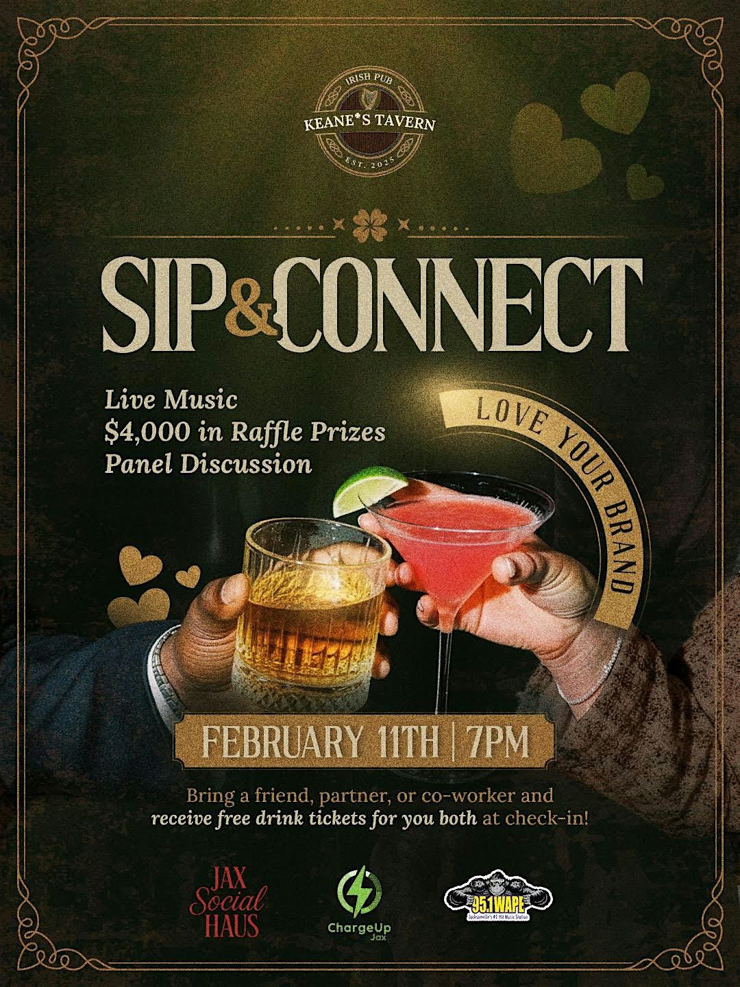 Sip & Connect returns this February with a Valentine-themed experience designed for Jacksonville entrepreneurs, creators, and business leaders who care about how their brand shows up and how their story is told.