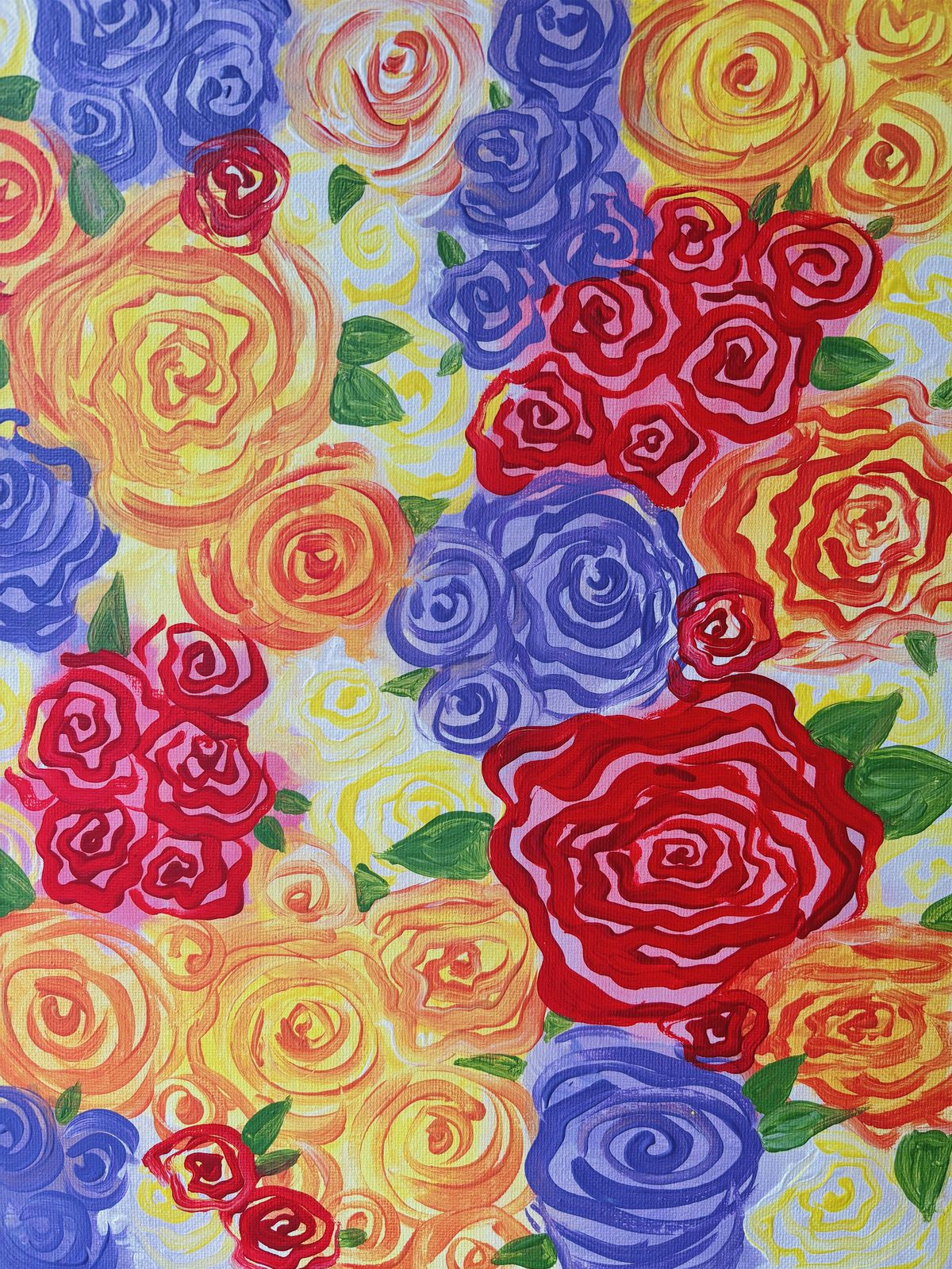 Bright purple, pink, and yellow roses come together in this fun, feel-good spring painting. With simple shapes and playful colors, it’s perfect for relaxing, sipping, and letting your creativity bloom—no experience needed, just enjoy the process! 🌸🎨