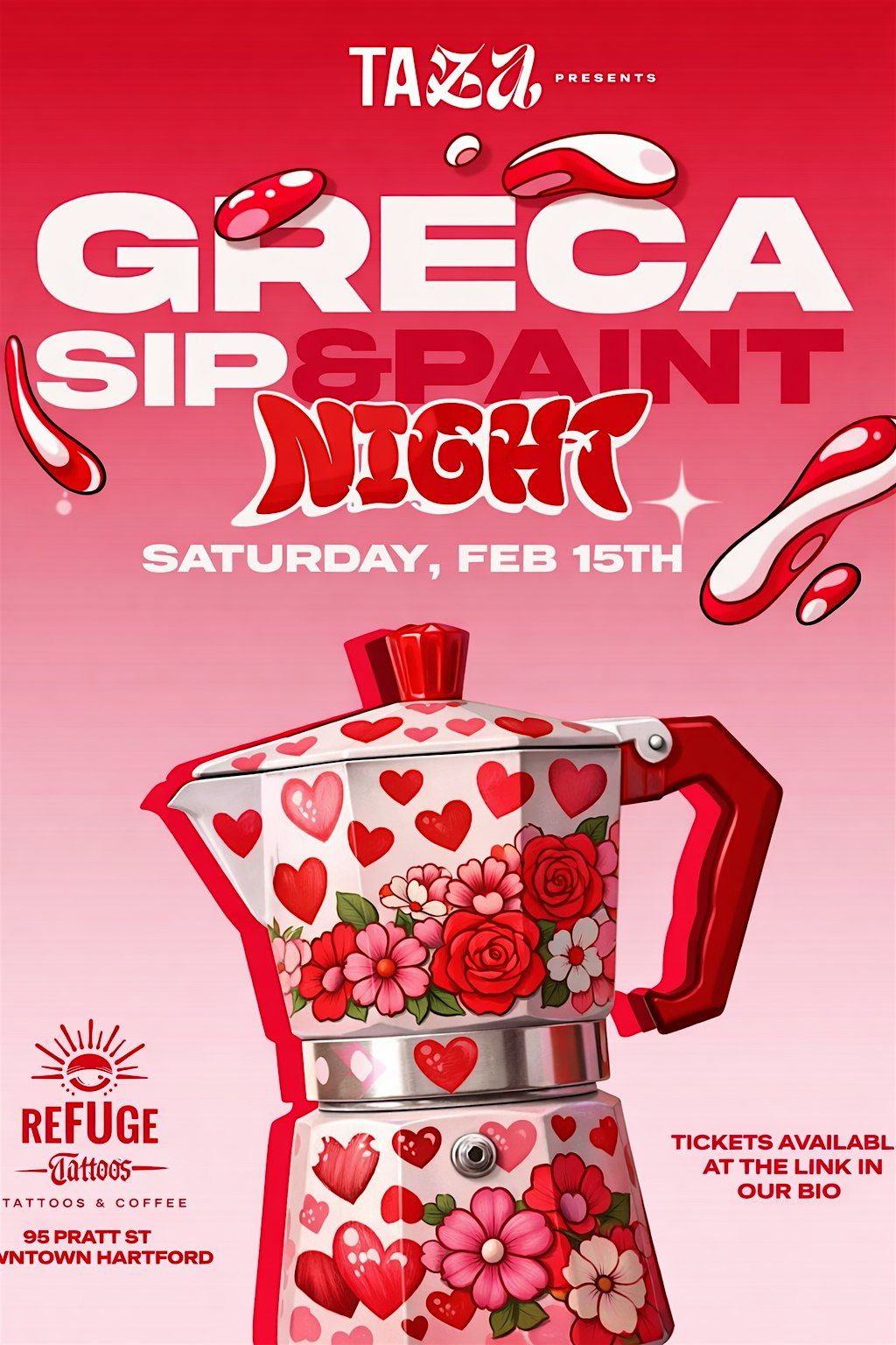 Welcome to SIP & PAINT NIGHT VALENTINES DAY EDITION! Join us at Taza Cafe on February 15, 2026 at 4:00 PM for a fun-filled evening of painting and sipping. Let your creativity flow as you enjoy a relaxing atmosphere with friends and loved ones. No experience needed - our talented instructors will guide you every step of the way. Unleash your inner artist and take home your masterpiece at the end of the night. Don't miss out on this special Valentine's Day edition event!