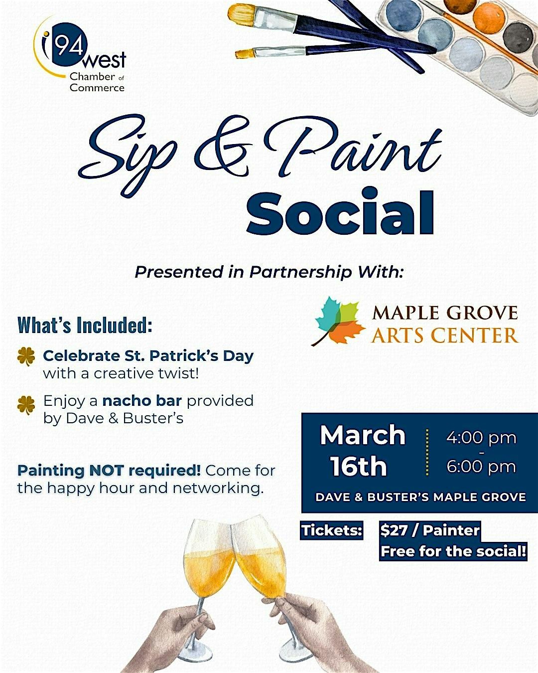 The guided painting experience will be led by the Maple Grove Arts Center and is $27 per painter. Space is limited to just 20 painters, so registration is required if you plan to paint. Not painting? No problem. The networking portion is free and open to anyone, so feel free to stop by, grab a drink, and make some new connections.