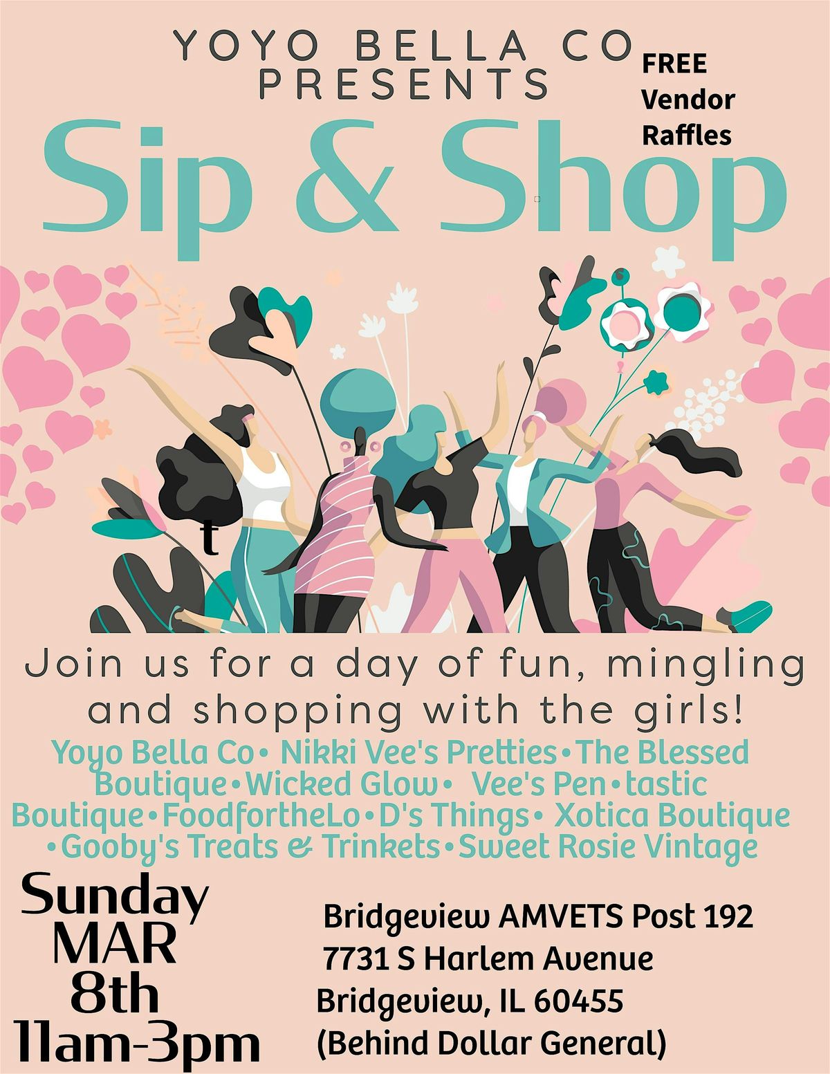 Ladies…We made it through the Holidays! And football season! So we are joining forces for a Sunday of sipping, mingling and shopping! We have assembled the Girls and bringing our best! Spring decor, the cutest candles, hand bags, accessories, bath & body, beaded pens, tasty sweet treats and mexi merchandise! Plan to sit down and eat with FoodfortheLO! Free admission. Free Parking. And Free Vendor Raffles- Entries must be received by 2:30pm! We will call winners between 2:30- 3pm! Grab your favorite beverage and mingle in our intimate and relaxed atmosphere! Hope to see you there! We start at 11am! 😉 #yoyobellaco #shopsmall #shoplocal #burbankillinois #bridgeviewillinois
