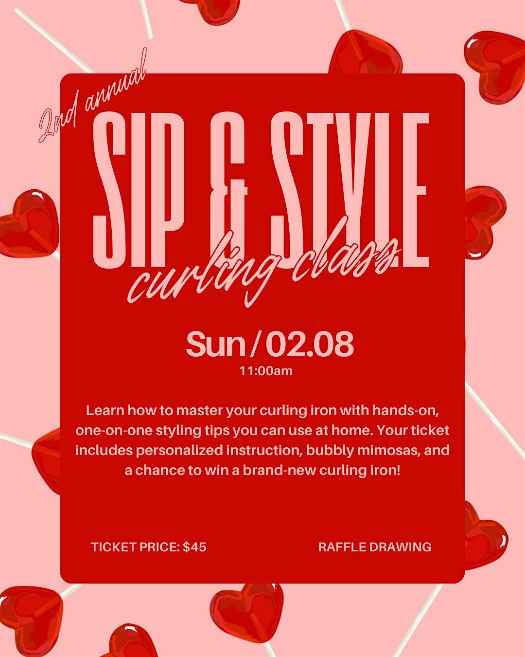 Together we will master your curling iron while learning all my tips and tricks! One on one guidance will help boost your confidence while styling you hair-just in time for Valentines Day. Grab a mimosa and let's get to styling!