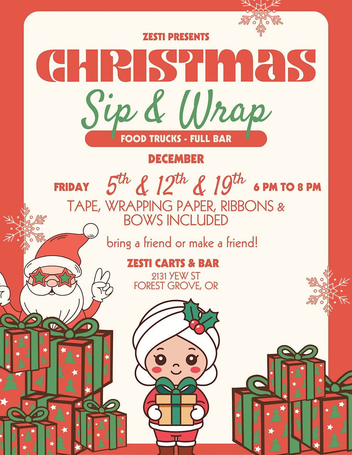 Tired of hiding in your closet to wrap gifts? Skip the stress and join us for Holiday Sip & Wrap at Zesti instead! We’re turning wrapping into a party! Grab a drink, roll out some paper, and make those presents look so good even Santa will be jealous.