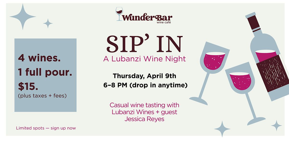 Find a favorite at our Sip In event! Sample four one oz pours of Lubanzi wine and then get a full pour of one of them at this open-house style event. Winery representative Jessica Reyes will be pouring, sharing stories from the winery, and answering your questions!