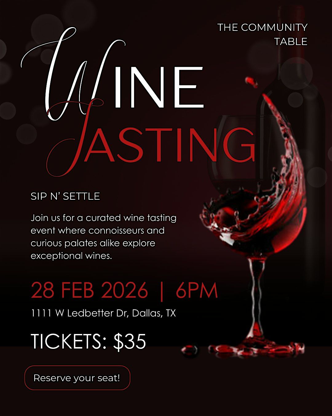 Join us for Sip N’ Settle, an intimate wine tasting designed for both seasoned wine lovers and curious palates. This thoughtfully curated evening invites you to slow down, sip intentionally, and enjoy exceptional wines in a warm, welcoming atmosphere.