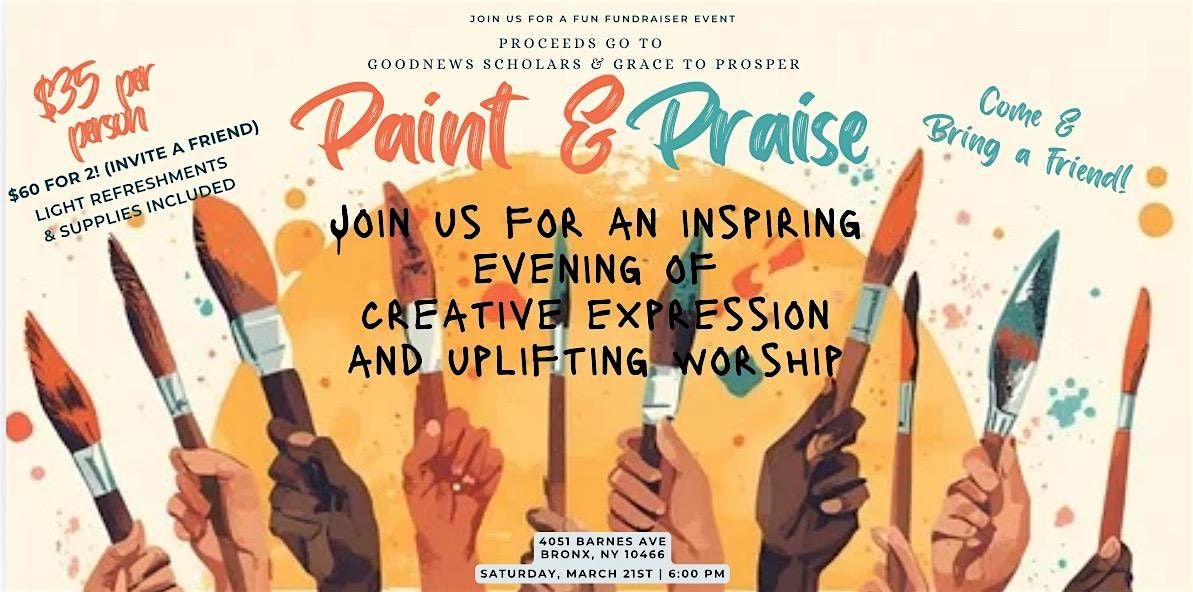 Get ready for a fun-filled evening where creativity meets good vibes. Whether you’re a painting pro or just love to sip and chill, this is the perfect chance to relax, express yourself, and share some positivity. It’s all happening in person, so come hang out, make friends, and leave with your own masterpiece. Don’t miss out on the laughter, the praise, and of course, the painting! And the best part, proceeds will support two local youth programs, Goodnews To Scholars, Inc. and Grace to Prosper, Inc.