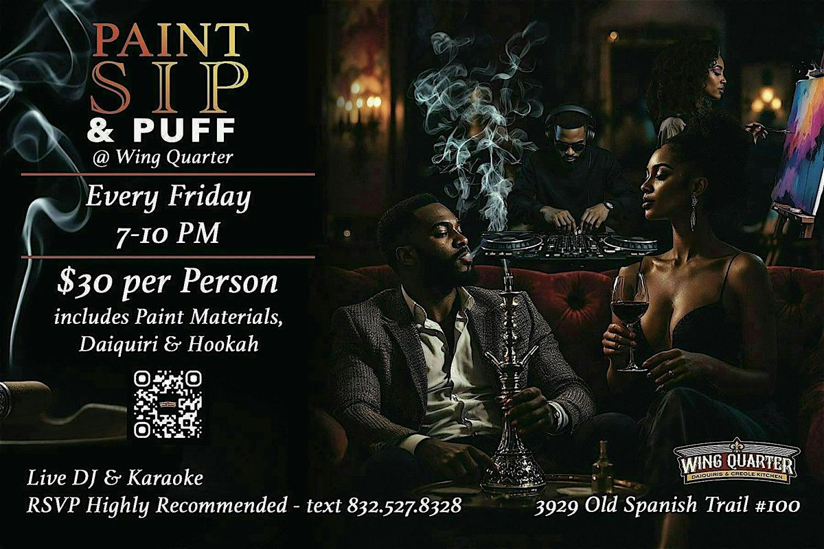 Come join us at Wing Quarter Daiquiris & Creole Kitchen for a fun-filled evening of creativity and relaxation! Grab a drink, pick up a paintbrush, and let your imagination run wild as you create your masterpiece. Whether you're a seasoned artist or just looking to unwind, this event is perfect for everyone. So come on down and get ready to sip, paint, and puff the night away!