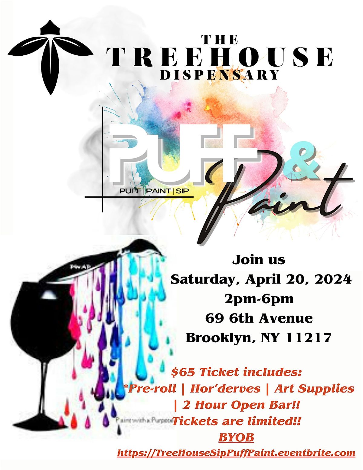 Welcome to Sip, Puff & Paint at The Tree House Dispensary, Inc.! Join us for a fun-filled event where you can enjoy sipping on drinks, puffing on your favorite products, and getting creative with paint. Let your imagination run wild as you express yourself on canvas in a relaxed and friendly atmosphere. No experience necessary - just come ready to have a good time! Grab your friends and come on down for a memorable evening of art and relaxation. See you there! BYOB