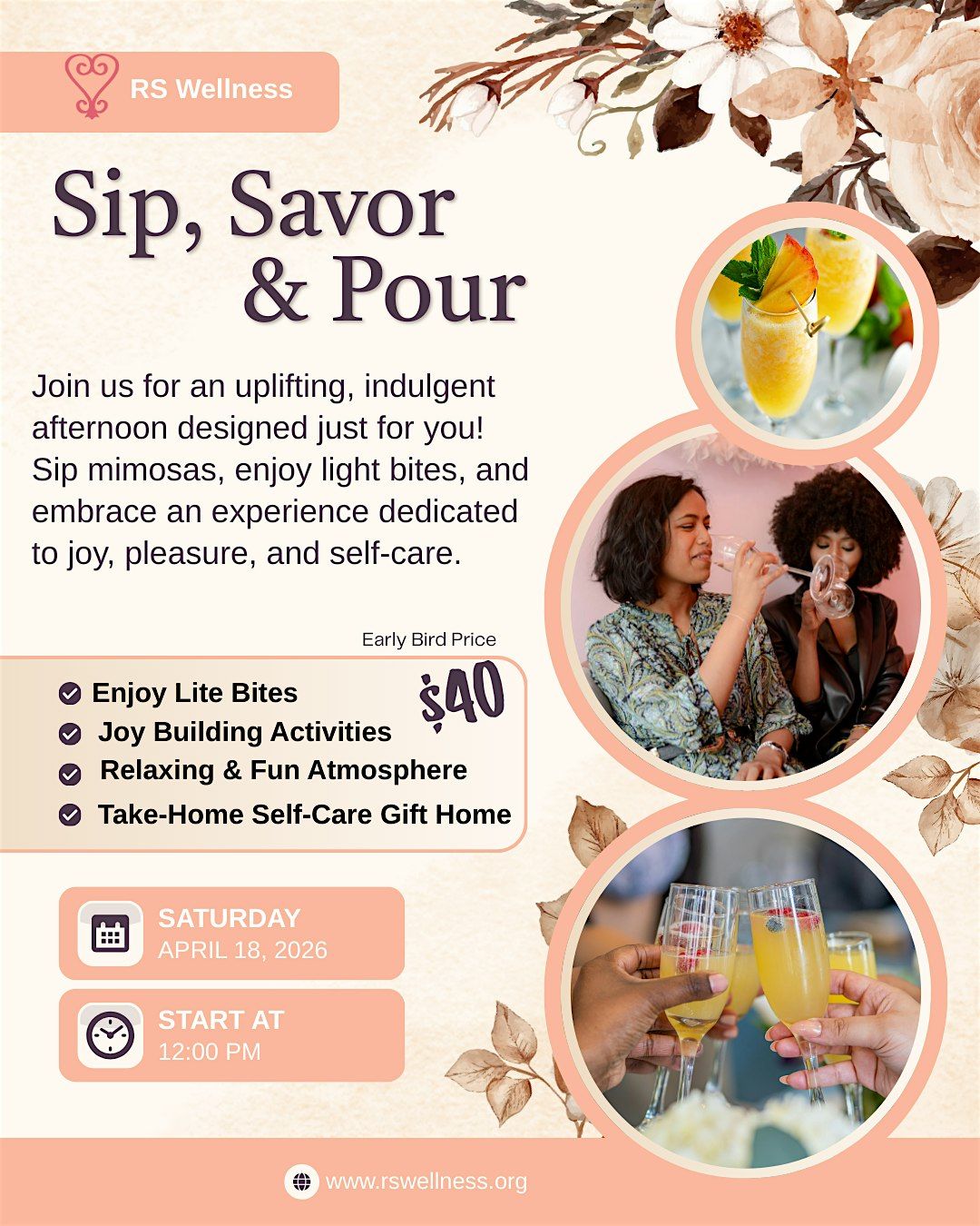 Enjoy refreshing mimosas, thoughtfully curated light bites, and meaningful moments of rest and pleasure designed to nourish both body and spirit. This experience centers on self-care, connection, and celebration, because joy is not a luxury; it’s a necessity.