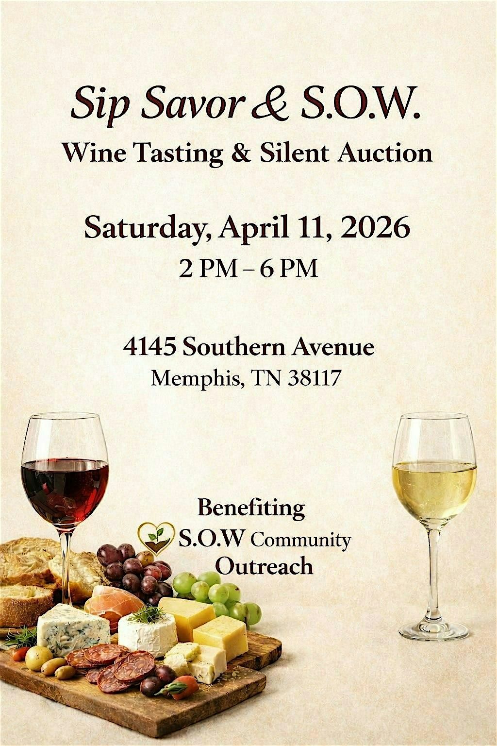 The event will take place at 4145 Southern Ave, Memphis, TN 38117. The facility sits in a great, convenient location. You will enjoy rich, savory wines along with great food, great music, great conversations and an opportunity to participate in a silent auction. Free parking is readily available on the property. Please present your ticket at the door for admission. You can purchase tickets by clicking this link: https://givebutter.com/sip-savor-and-sow-wine-tasting-silent-auction-fundraiser-j7ozr2 , or you can go to our website at sowloveproject.org, or purchase directly on Eventbrite.