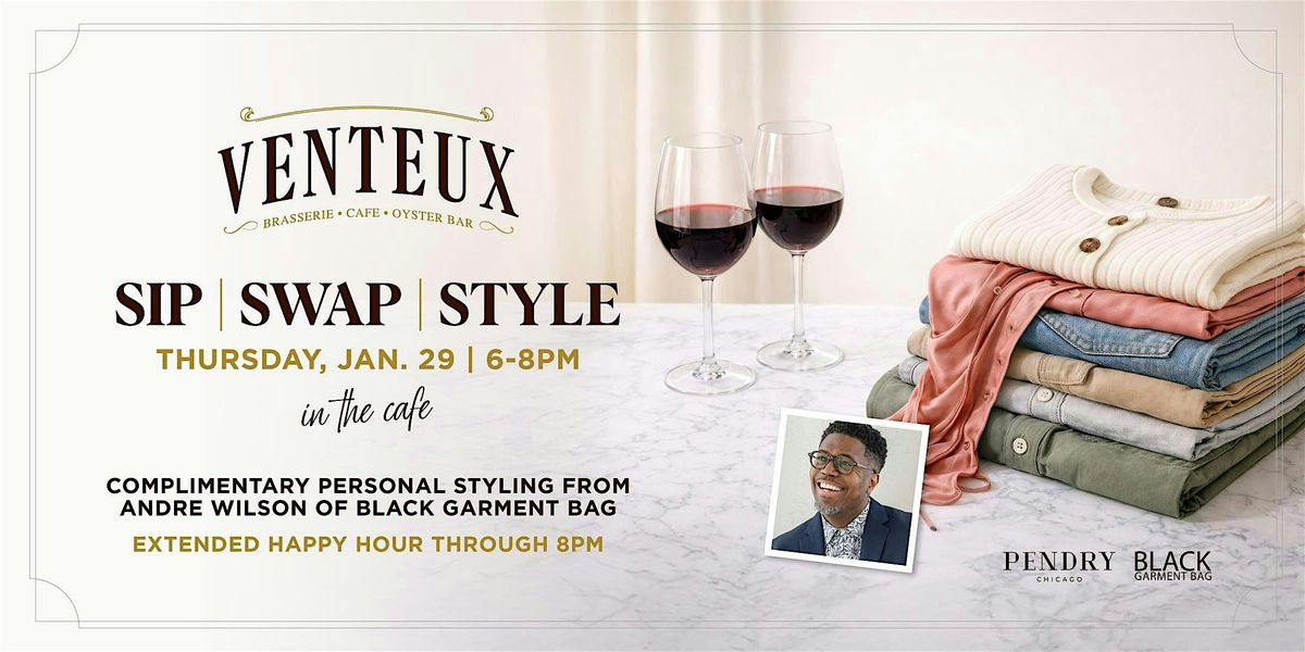 Venteux invites you to bring 5 - 10 gently worn clothing items to swap and receive complimentary styling from Andre Wilson of Black Garment Bag. Wine specials at Happy Hour will be available throughout the event!