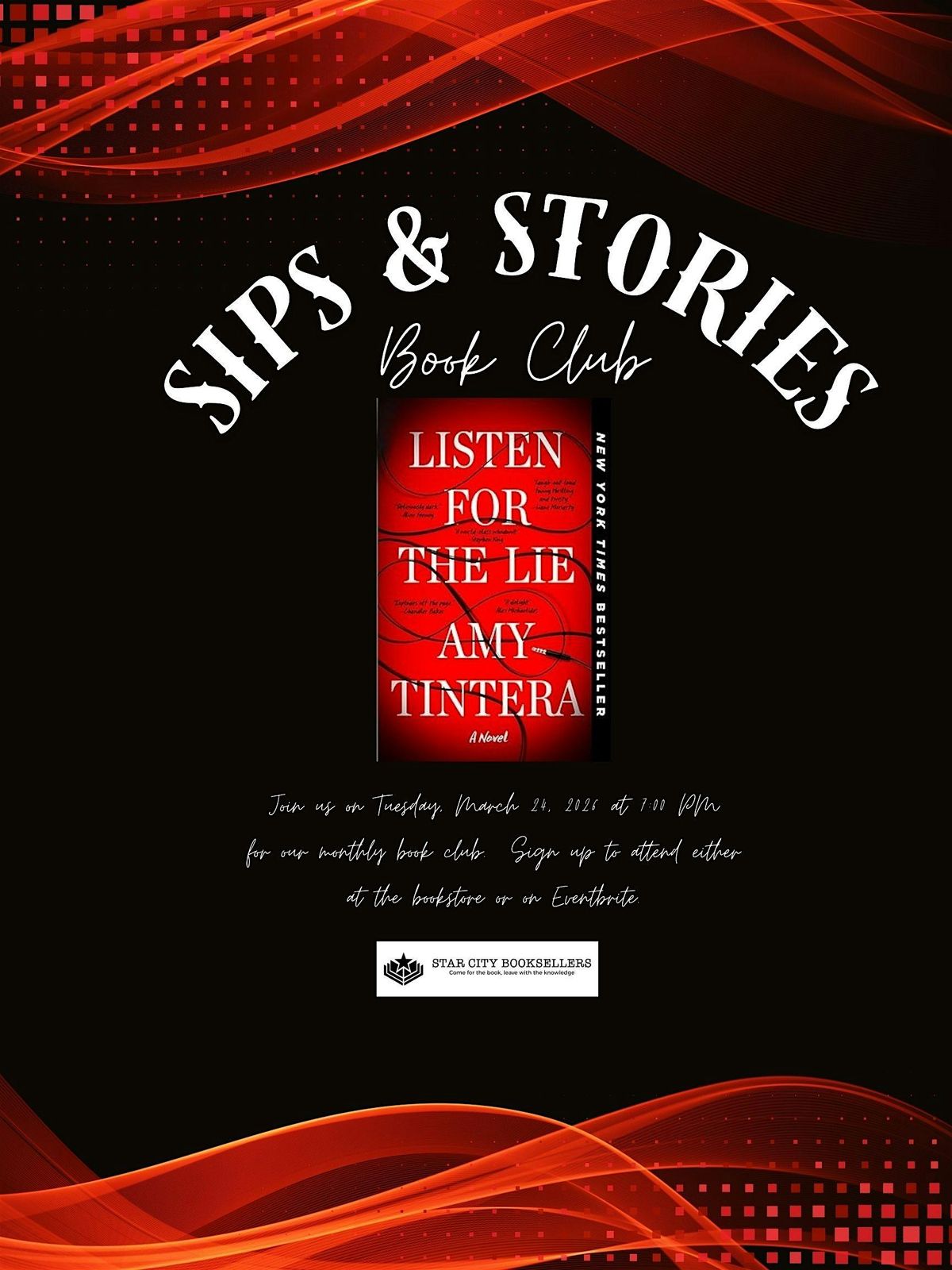 Join us for our monthly, store sponsered book club where we will be discussing the psychological thriller "Listen for the Lie" by Amy Tintera.