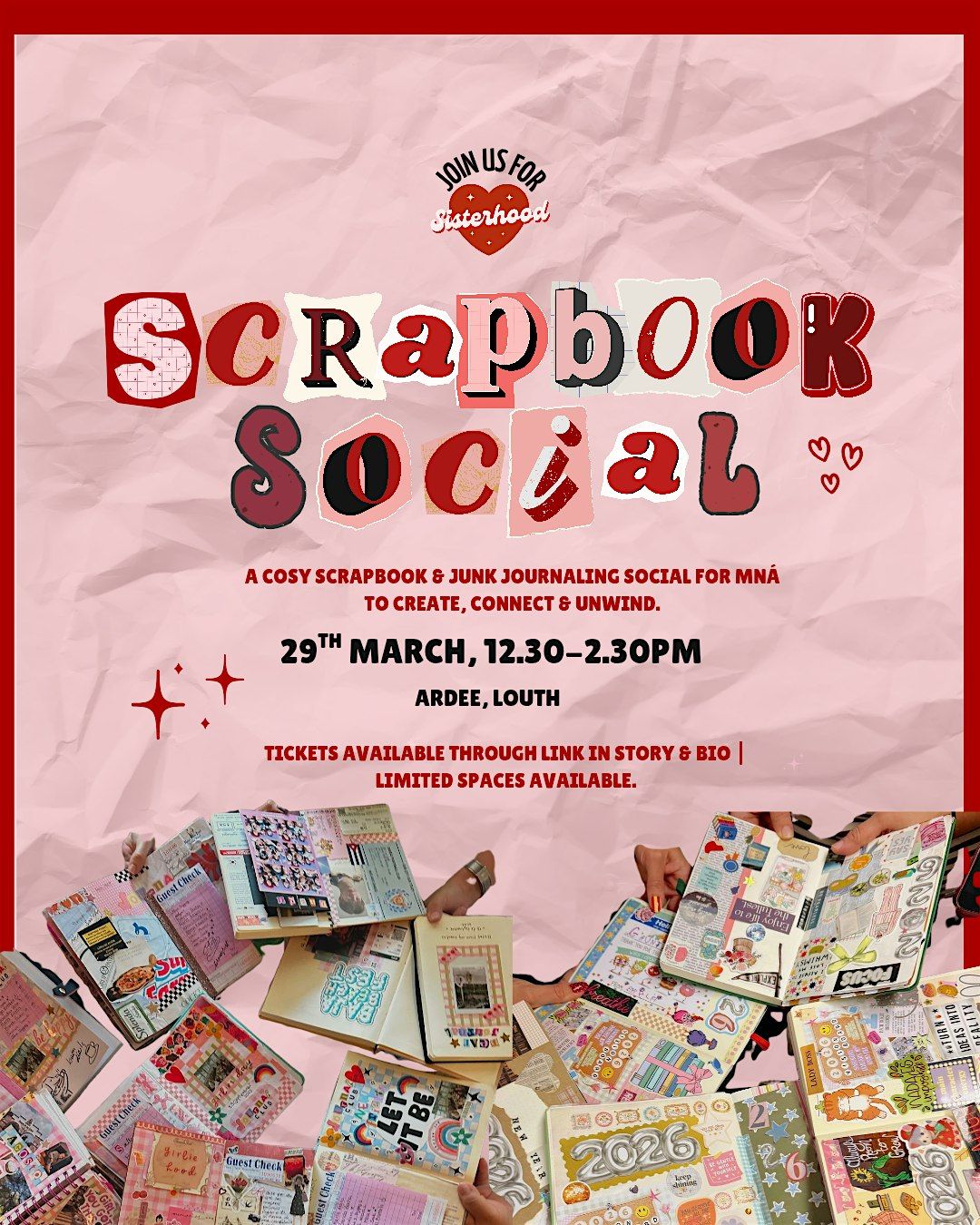 Scrapbook Social is a cosy creative afternoon designed for mná to relax, connect and get creative. Think scrapbook meets junk journaling, a light hearted space filled with uplifting music, good chats, and a wide range of craft supplies to explore.