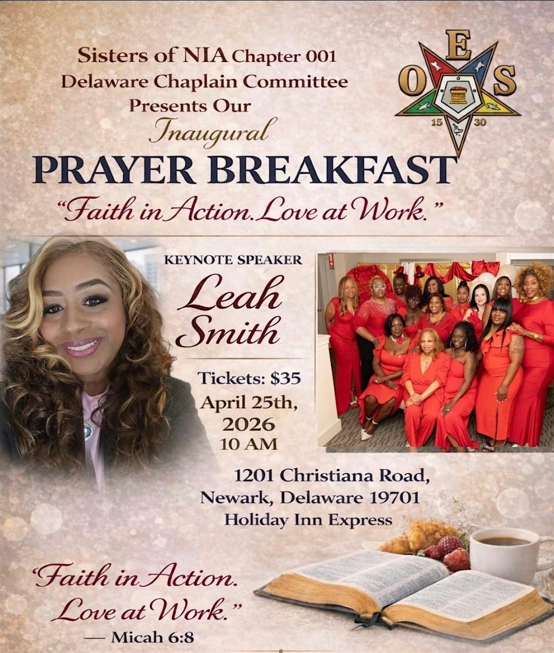 Join Sisters of Nia, Chapter 001, Delaware for our Inaugural Prayer Breakfast, a powerful morning of faith, fellowship, and intentional prayer. This sacred gathering will bring women together in a spirit of unity, praise, and reflection as we seek spiritual renewal and collective strength. We are honored to welcome Pastor Leah Smith as our featured speaker, who will lead and pour into women through prayer, encouragement, and a timely word designed to uplift, challenge, and inspire.