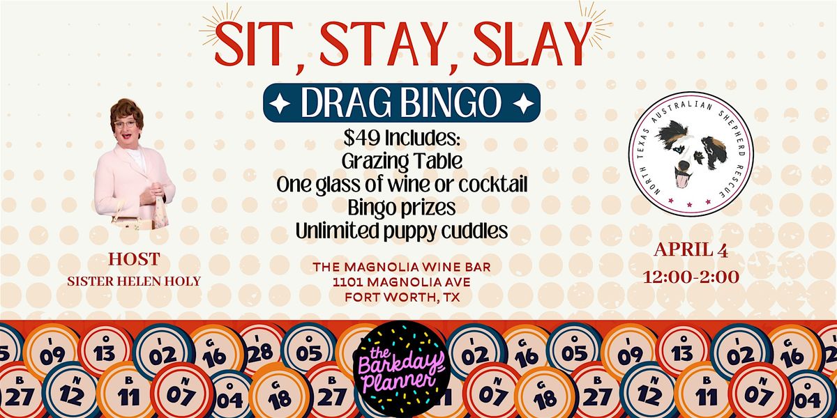 Get ready for a fabulous day out to Sit, Stay, Slay at Drag Bingo! Join us in person for an afternoon full of laughs, bingo, and some seriously adorable puppies from North Texas Australian Shepherd Rescue! Bring your friends, your best vibes, and prepare to slay the game while enjoying amazing puppy snuggles and wine. Each ticket includes bingo, grazing table, one glass of wine of cocktail, bingo prizes, and unlimited puppy cuddles.