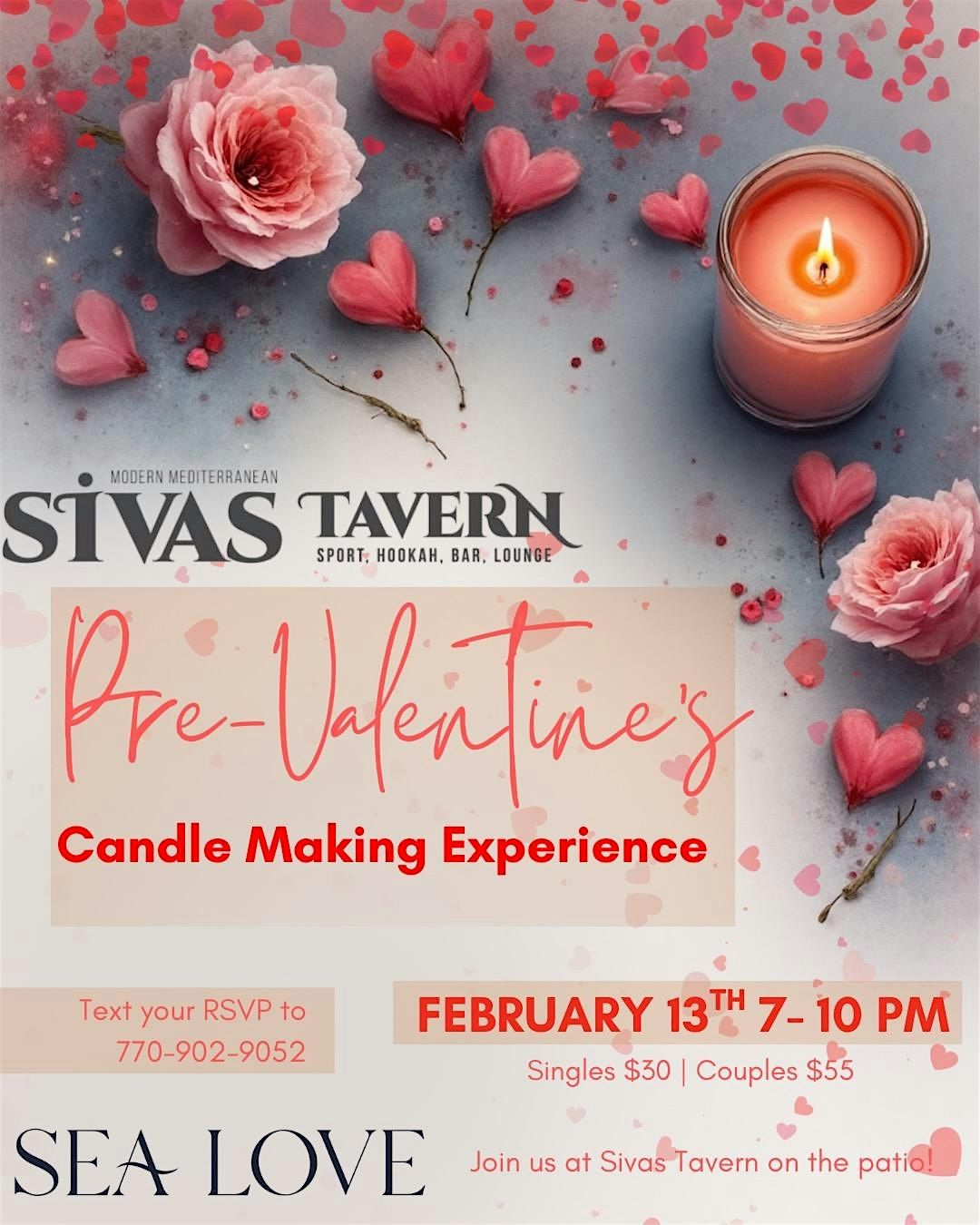 Celebrate the season of love with a Pre-Valentine’s Candle Making Experience at Sivas Tavern. Guests will enjoy a hands-on candle-making session in a cozy patio setting, perfect for singles, couples, or friends looking for a unique night out.