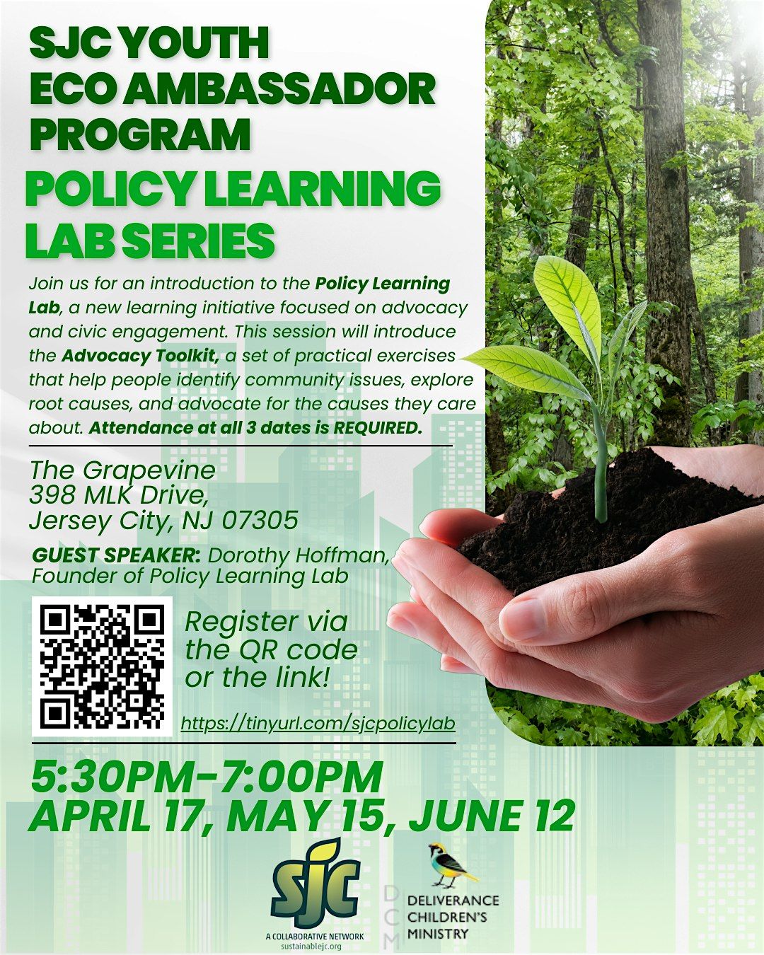 Join us for this Policy Learning Lab Series, hosted by DCM, featuring Guest Speaker Dorothy Hoffman, Policy Learning Lab Founder. Participants will learn how to engage in Jersey City policy decisions and Green Civics. Attendance is required at all 3 sessions to be accepted into these training workshops