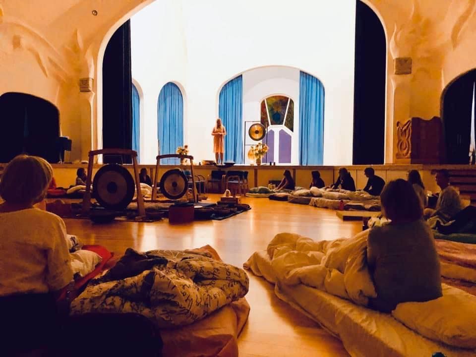 Klangskåle, gong og syngeskåle sættes i svingninger og lyder gennem hele natten suppleret af gongens dybe bas frekvenser.