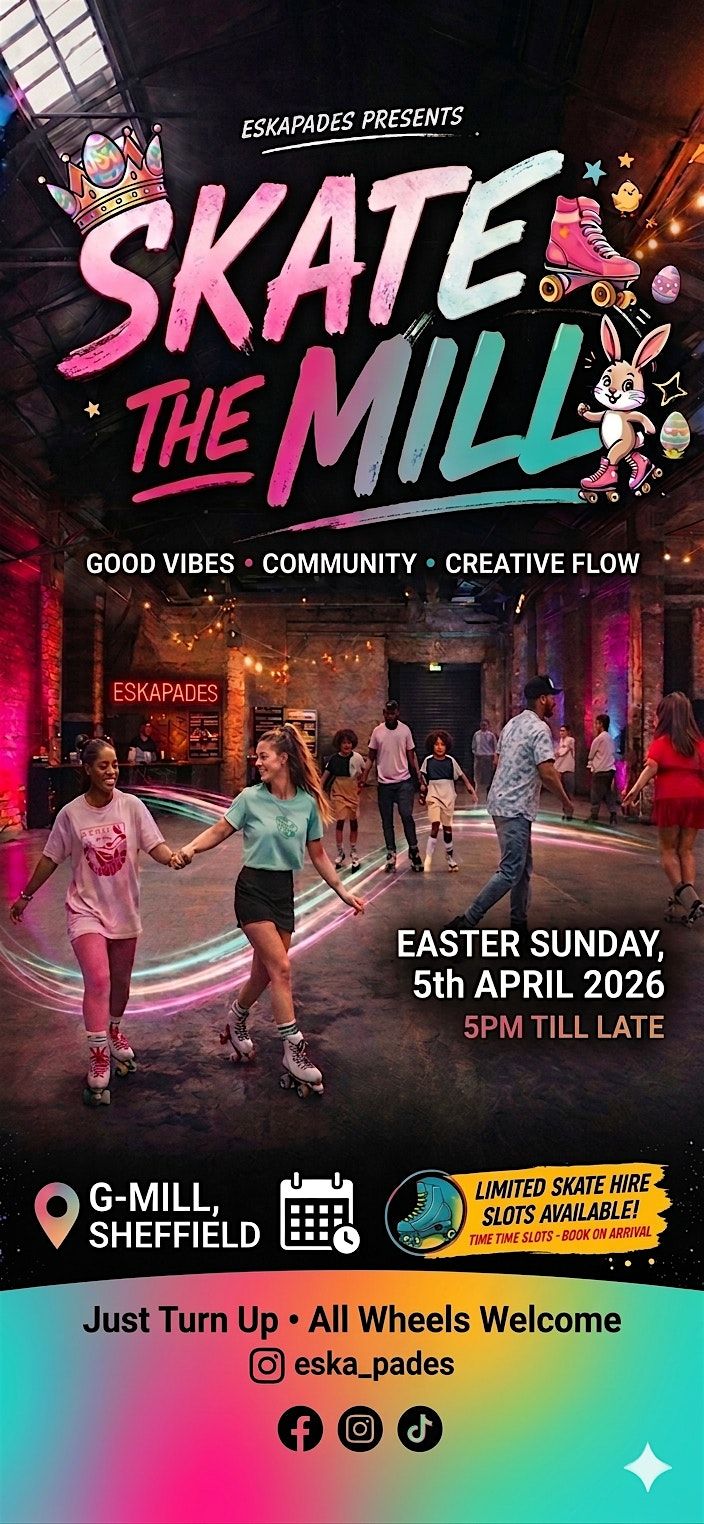 Join Eskapades for a series of roller skate sessions at the G-Mill in Sheffield. Whether you’re brand new, a bit rusty, or fully in your flow, this is a welcoming space to move, connect, and enjoy yourself.