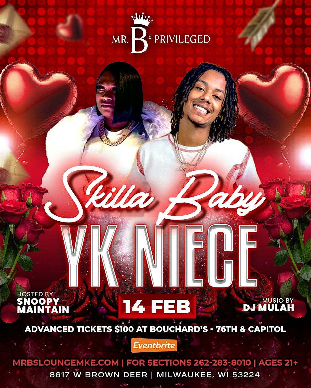 Get ready for an epic night this Valentine's Day! Join us in person for a live performance by Skilla Baby and YK Niece. It's gonna be a vibe you don't wanna miss—good music, great energy, and the perfect way to celebrate love and friendship. Bring your crew and let's make some unforgettable memories together!