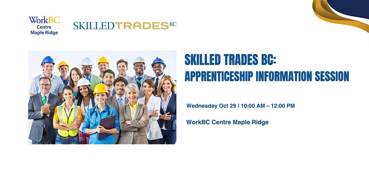 Join WorkBC Centre Maple Ridge for an interactive information session with SkilledTradesBC, that leads and coordinates B.C.’s skilled trades system, including overseeing apprenticeship training and trade certifications in BC.