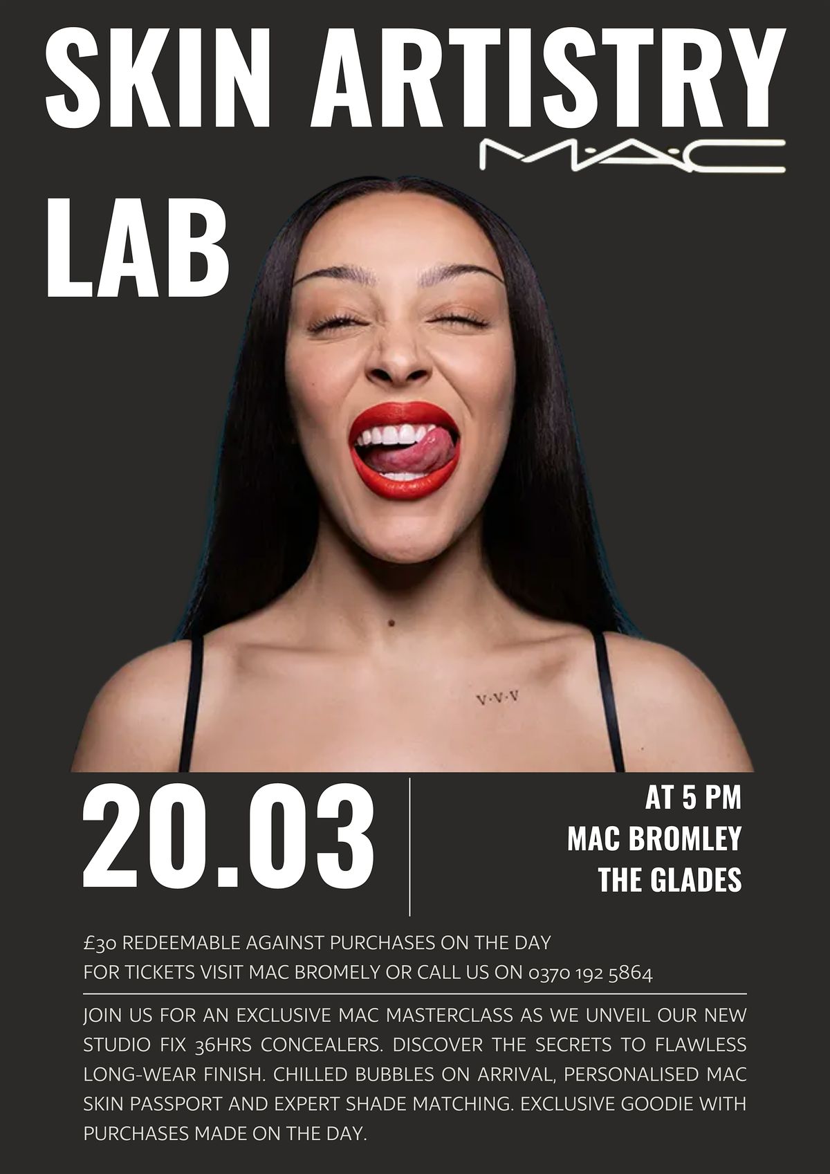 Join us for an exclusive MAC MASTERCLASS. Discover the secrets to flawless Long-Wear finish. Chilled bubbles on arrival, personalised MAC skin passport and expert shade matching. Exclusive goodie bag with purchase on the day. Cost redeemable by product.
