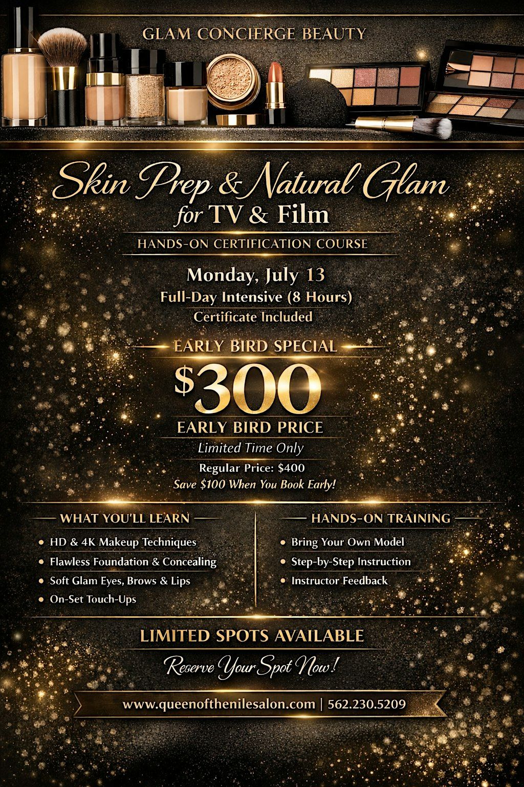 Join our Full-Day Skin Prep & Natural Glam for TV & Film Certification Course on Monday, July 13.