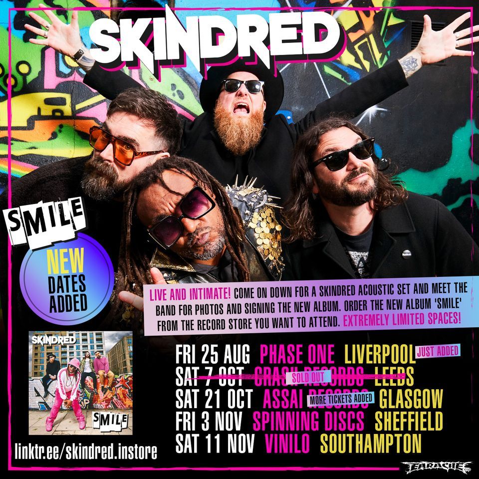 Live and intimate! Catch Skindred play an acoustic set and meet the band for photos and signing their new album ‘Smile’ at Spinning Discs, Sheffield.Order the new album ‘Smile’ from Spinning Discs via linktr.ee/skindred.instore to guarantee entry. Extremely limited spaces!
