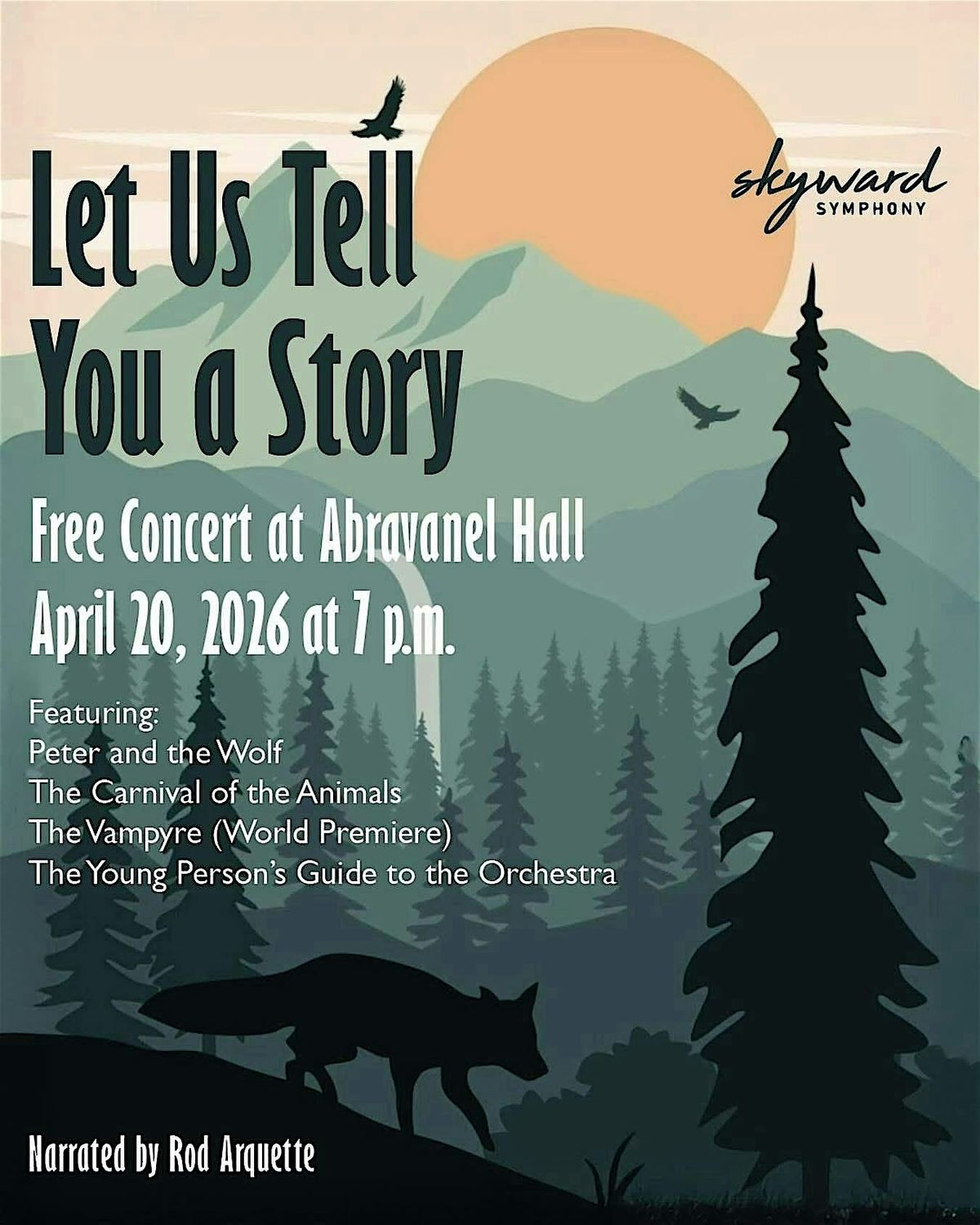 Join Skyward Symphony for a free, family-friendly concert that brings music and storytelling together. On April 20, 2026 at 7:00 p.m., experience an evening at Abravanel Hall designed to introduce audiences of all ages to the power of orchestral music. The program features beloved classics and new works, including Peter and the Wolf, The Carnival of the Animals, The Vampyre (World Premiere), and The Young Person’s Guide to the Orchestra, all narrated by Rod Arquette. Admission is free. Bring your family, invite a friend, and enjoy an evening where stories come to life through music. No tickets needed.