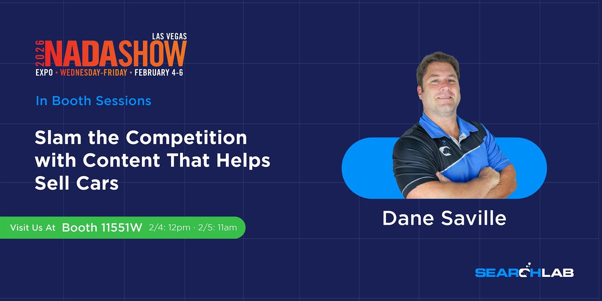 Welcome to Slam the Competition with Content that Helps Sell Cars - Dane Saville! Join us at NADA in the Las Vegas Convention Center West Hall on February 4, 2026 at 12:00 PM) for an exciting in-booth session. Learn how to create compelling content that drives sales in the automotive industry. This is your chance to gain valuable insights from industry expert Dane Saville. Don't miss out on this opportunity to level up your content game and stay ahead of the competition. See you there!