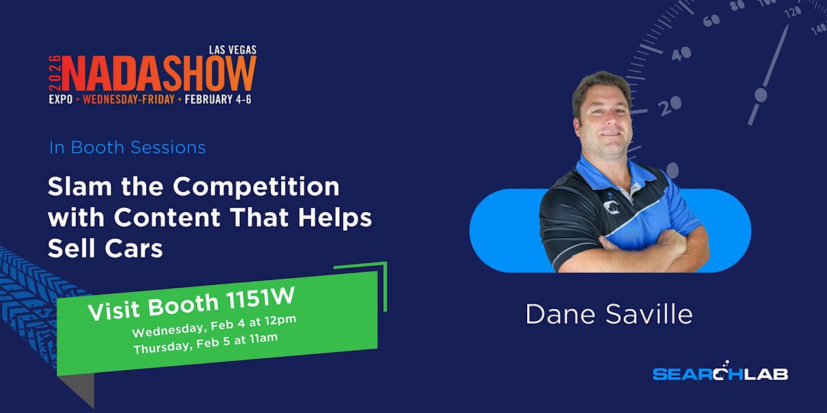Welcome to Slam the Competition with Content that Helps Sell Cars - Dane Saville! Join us at NADA in the Las Vegas Convention Center West Hall on February 4, 2026 at 12:00 PM) for an exciting in-booth session. Learn how to create compelling content that drives sales in the automotive industry. This is your chance to gain valuable insights from industry expert Dane Saville. Don't miss out on this opportunity to level up your content game and stay ahead of the competition. See you there!