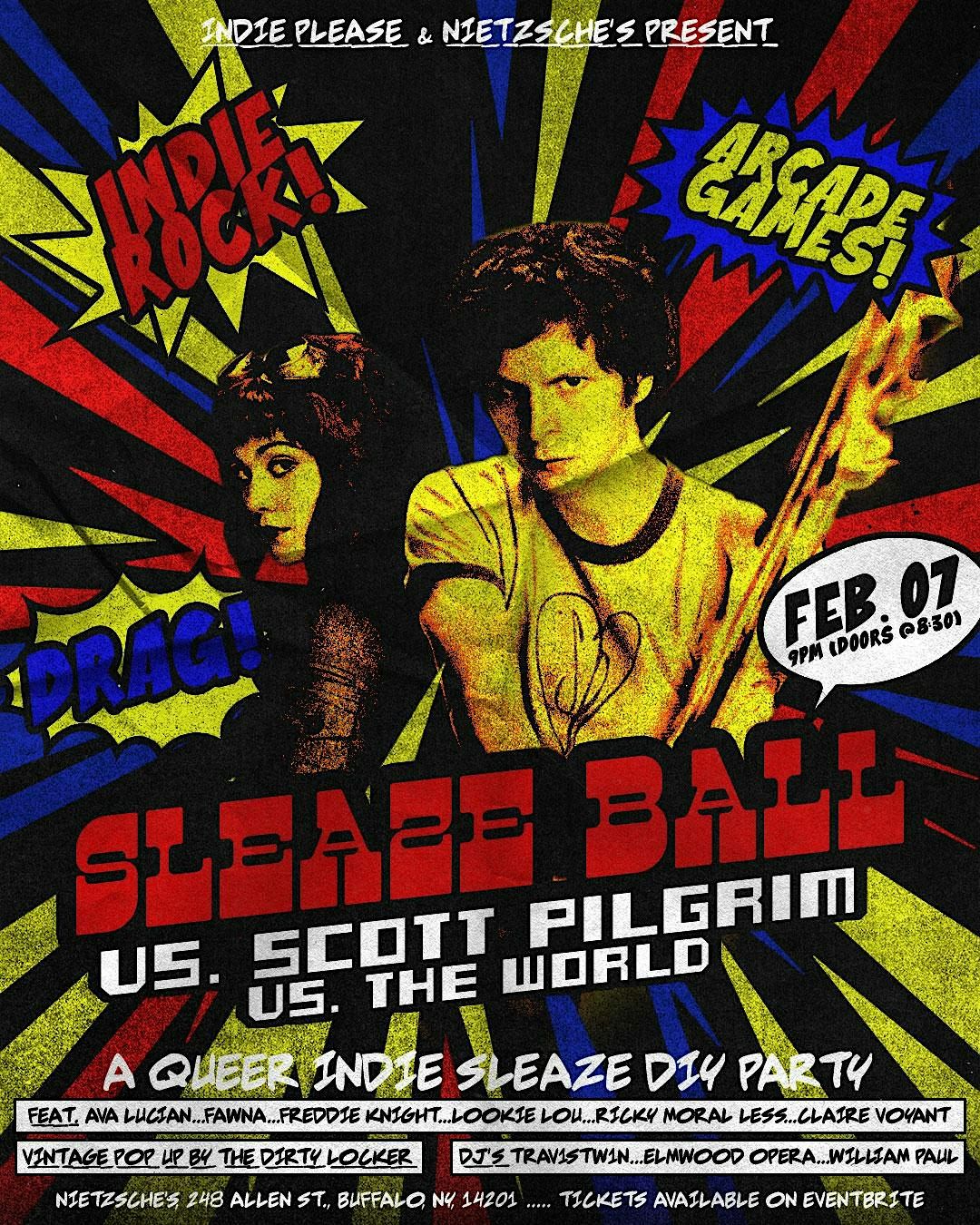 sleaze ball returns with a night inspired by edgar wright’s 2010 cult classic scott pilgrim vs. the world - where indie rock, video games, electro-pop, and hot evil exes all collide for a night of dancing, drag, and debauchery