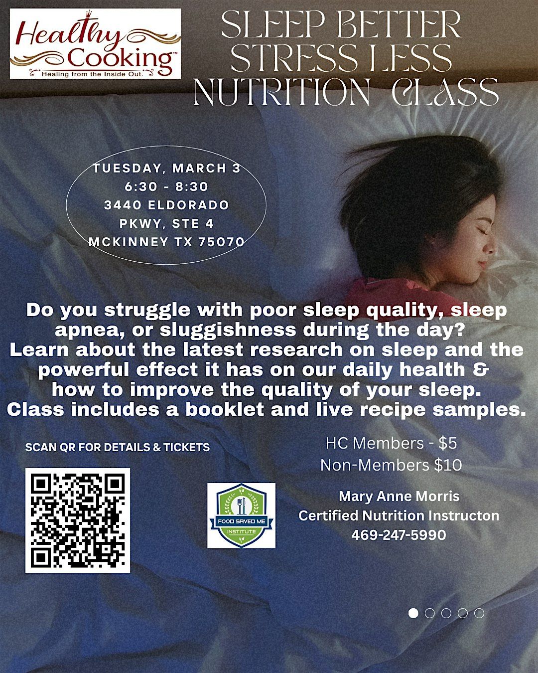 Ready to be equipped with practical tips on what to eat and when to eat certain foods that naturally improve the quality of sleep? Get inspired by how great an impact quality sleep has on all areas of health include our weight. This class is taught by a Certified Nutrition Instructor and includes a booklet of research and recipes, and recipe samples made in class! Bring your friends with you!