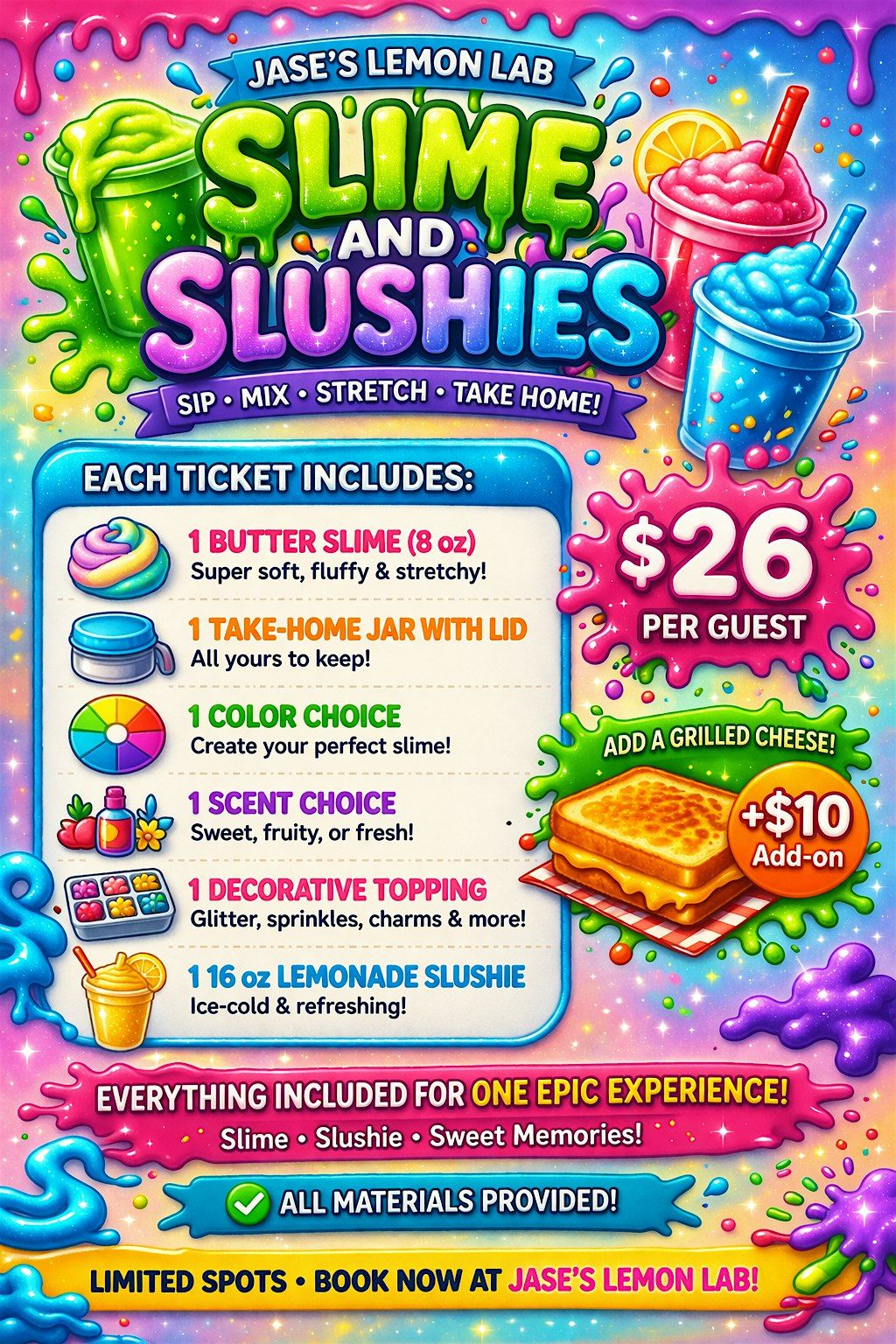 Make Butter Slime + Slushie Each ticket:1 butter slime (8 oz) 1 jar with lid 1 color 1 scent 1 decorative topping 1 16 oz lemonade