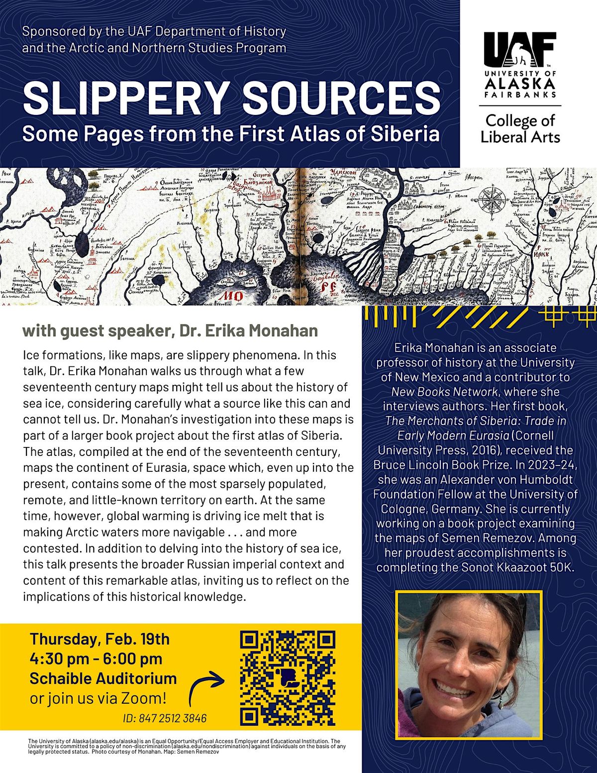Ice formations, like maps, are slippery phenomena. In this talk, Dr. Erika Monahan walks us through what a few seventeenth century maps might tell us about the history of sea ice, considering carefully what a source like this can and cannot tell us. Dr. Monahan’s investigation into these maps is part of a larger book project about the first atlas of Siberia. The atlas, compiled at the end of the seventeenth century, maps the continent of Eurasia, space which, even up into the present, contains some of the most sparsely populated, remote, and little-known territory on earth. At the same time, however, global warming is driving ice melt that is making Arctic waters more navigable . . . and more contested. In addition to delving into the history of sea ice, this talk presents the broader Russian imperial context and content of this remarkable atlas, inviting us to reflect on the implications of this historical knowledge.