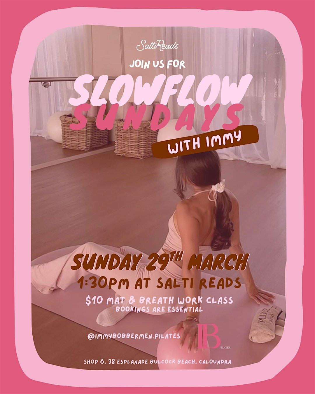 Ease into your Sunday with a calming and restorative Slowflow Pilates session at Salti Reads. This 80-minute class blends gentle mat Pilates with guided breathwork to help you slow down, reconnect with your body, and reset for the week ahead.
