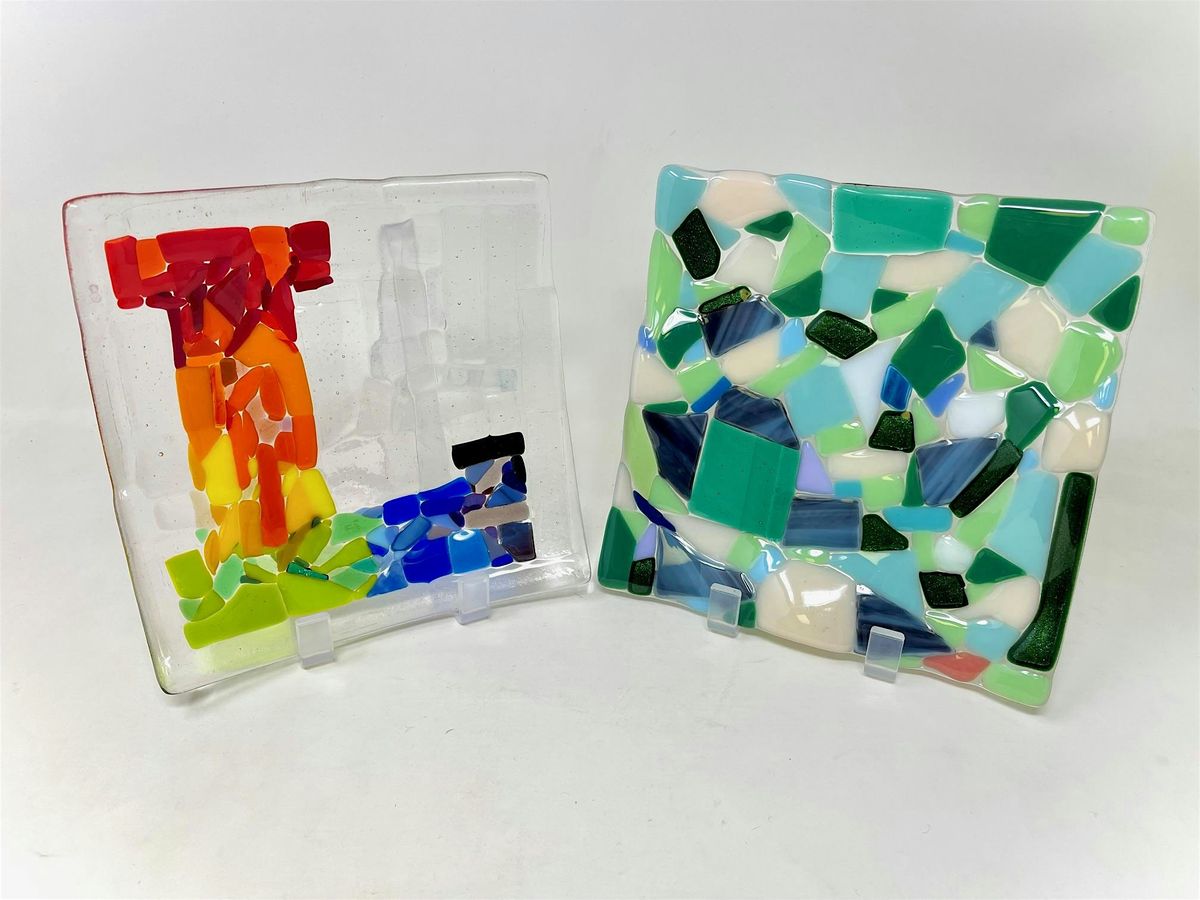 In this 2 hour class, our artist instructors guide you thru the design process, the glass prep, of cutting, nipping, edging, layout, proper portions, and even in this info, allow you to create and plan for a shallow vessel. This 2 stage planning and final process requires more designing and planning for color placement ..You decide in-studio which one you want to create..and we help you get to the end of your introductory fusing/slumping project.