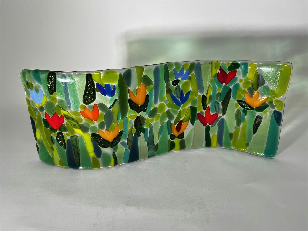 In this 2 hour class, our artist instructors guide you thru the design process, the glass prep, of cutting, nipping, edging, layout, proper portions, and even in this info, allow you to create and plan for a shallow vessel. This 2 stage planning and final process requires more designing and planning for color placement ..You decide in-studio which one you want to create..and we help you get to the end of your introductory fusing/slumping project.