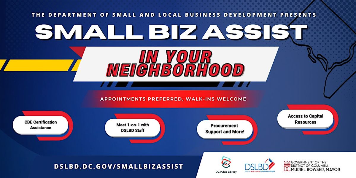 Welcome to DSLBD's Small Biz Assist in Your Neighborhood event at Capitol View Neighborhood Library! Join us on March 24, 2026 from 10:00 AM - 6:00 PM (Eastern Time) for a day filled with valuable insights and resources to help your small business thrive.