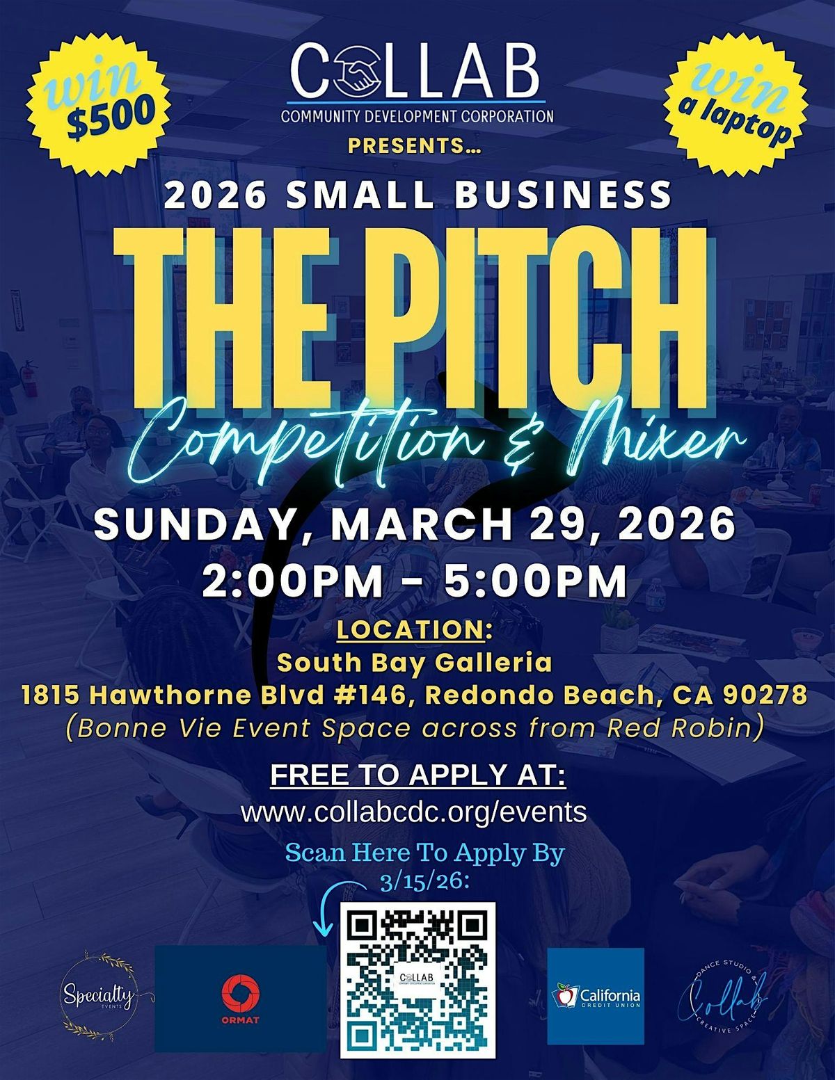 Get ready to showcase your creativity and innovation at this exciting event happening at BONNE VIE AT THE SOUTH BAY GALLERIA. Whether you are pitching your businesses concept, a new product or service, or a unique project, this is your chance to shine in front of a live audience. Join us for a day filled with pitches, networking, and fun. Don't miss out on this opportunity to make your ideas come to life and elevate your organization. One lucky winner will receive a $500 grant from our sponosors CALIFORNIA CREDIT UNION AND ORMAT, and the runner up will receive a brand new laptop!!!