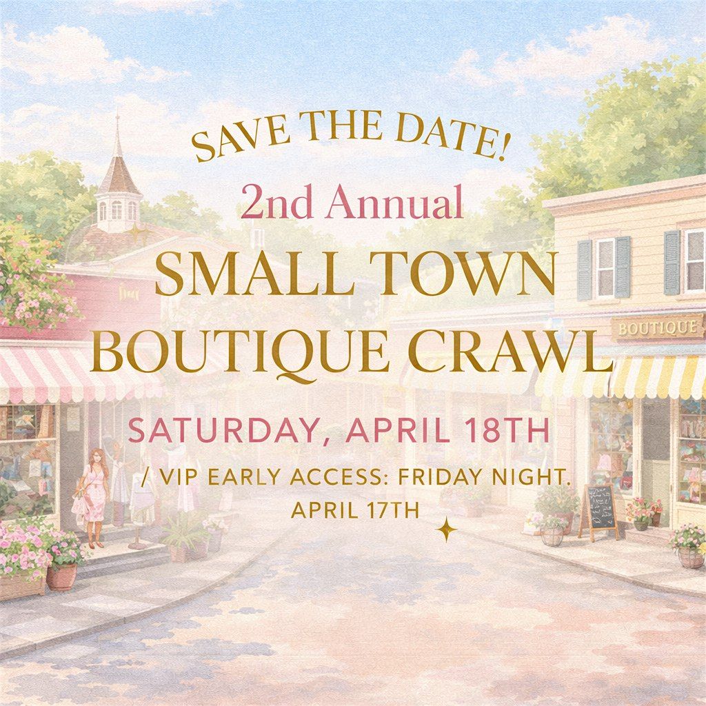 Get ready for a day of shopping, supporting local businesses, and discovering hidden gems! Join us for the Small Town Boutique Crawl 2026 where you can explore unique boutiques, find one-of-a-kind items, and enjoy exclusive discounts. Whether you're a fashionista looking for the latest trends or just want to browse and have fun, this event is perfect for you. Grab your friends and make a day of it! Don't miss out on this opportunity to shop local and find something special.