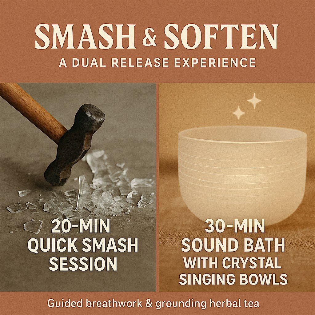 What’s Included:20-min Smash Session (glassware only)30-min Sound Bath w/ Crystal BowlsGuided reset with AffirmationsGrounding Herbal TeaAromatherapy - LavenderYoga MatJournal + Pen