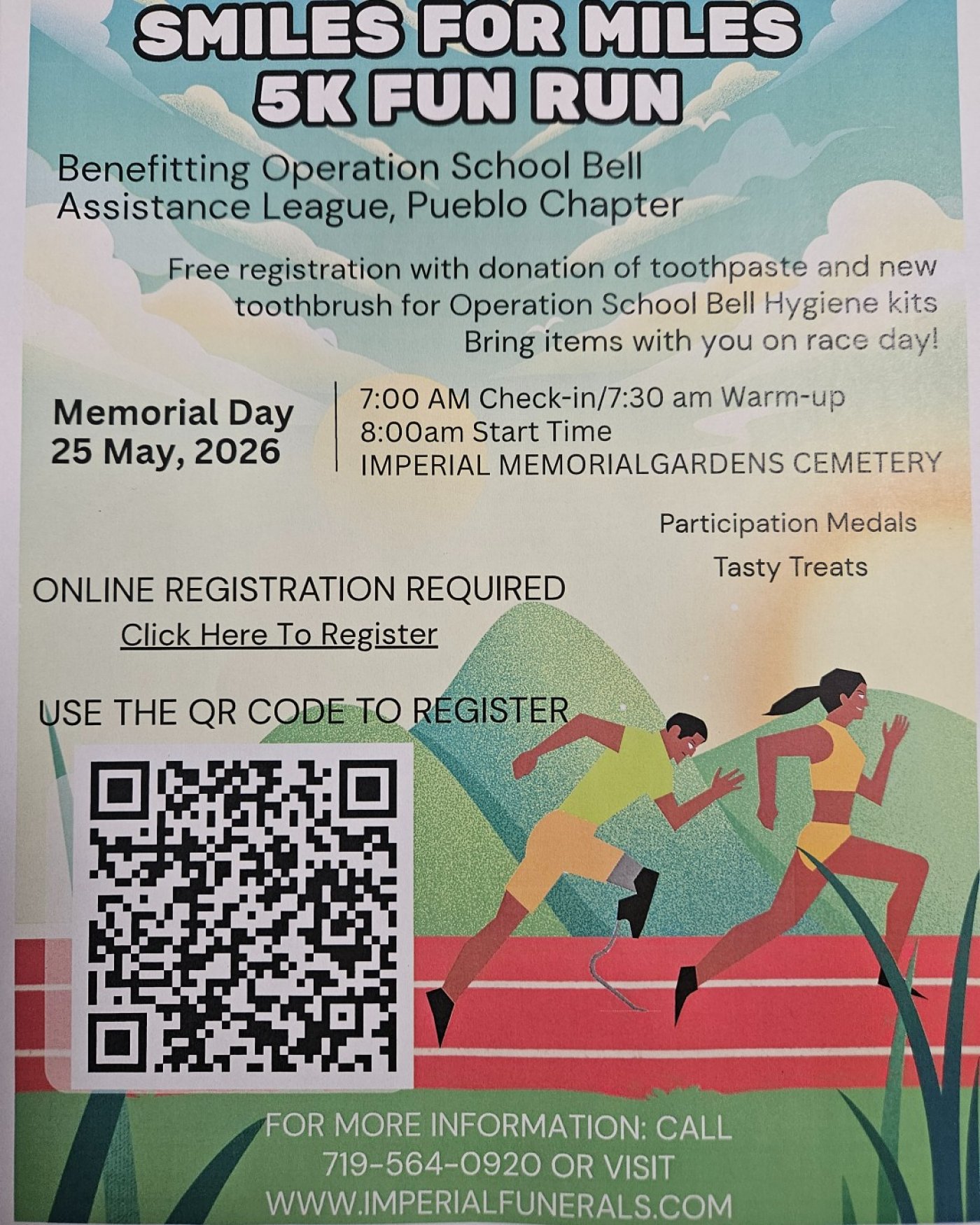Celebrate Memorial Day by joining our 5K Fun Run/Walk at Imperial Memorial Gardens. Please bring a new tube of toothpaste and toothbrush. These items will be donated to Pueblo Assistance League's Operation School Bell. They provide hygiene kits and new clothes to school age children in need. Visit https://runsignup.com/Race/CO/Pueblo/SmilesForMilesMemorialDayFunRun to register.