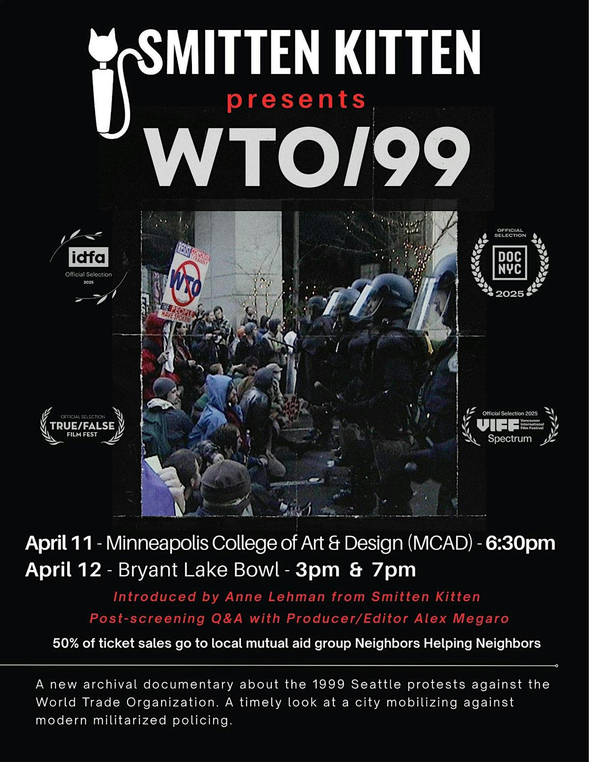 Introduced by Anne Lehman from Smitten Kitten. Post-screening Q&A with WTO/99 Producer & Editor Alex Megaro.